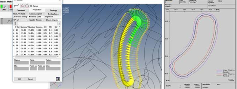 ZEISS CALYPSO curve enables measurements and analyses of 2D curves (intersection on one plane), 3D curves (intersection on a cylinder or freeform surface), lift curves, known and unknown contours and symmetry curves. Numerous curve-related characteristics can also be reported, including curve slope, curve stroke, curve distance, curve expansion, curve length, surface area, speed and acceleration.
